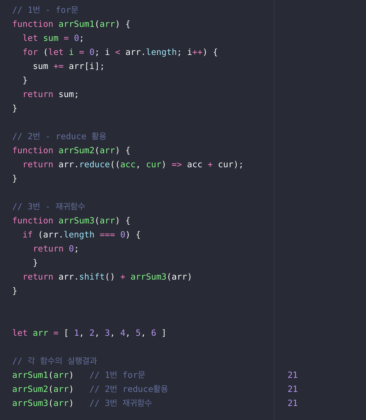 | 배열의 0번째 요소부터 마지막 요소까지 모두 더하기 (for문, reduce, 재귀함수) (0) | 2021.10.08 |